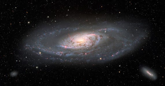 At first glance, Messier 106 appears as a beautiful spiral galaxy with sweeping arms that are adorned with bright knots of star formation and dark lanes of dust. Its structure resembles that of our own Milky Way galaxy, albeit with some unique characteristics.
